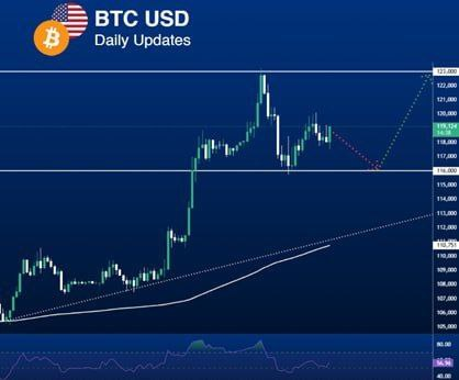 يظهر شارت البيتكوين مقابل الدولار الأمريكي (BTC/USD) استمرار التماسك فوق الدعم الرئيسي عند 117,000، بعد تصحيح هابط من القمة المسجلة عند 122,000.