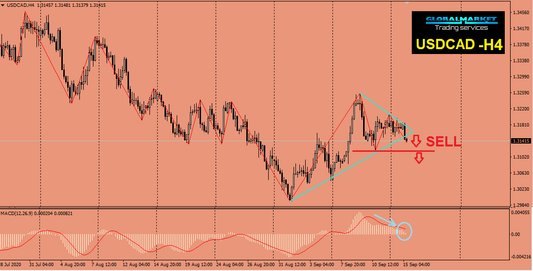 الدولار الكندى يميل الى الضغوط السلبية الدخول بيع عند ظهور الترشيح على ال MACD وكسر اخر قاع على h4