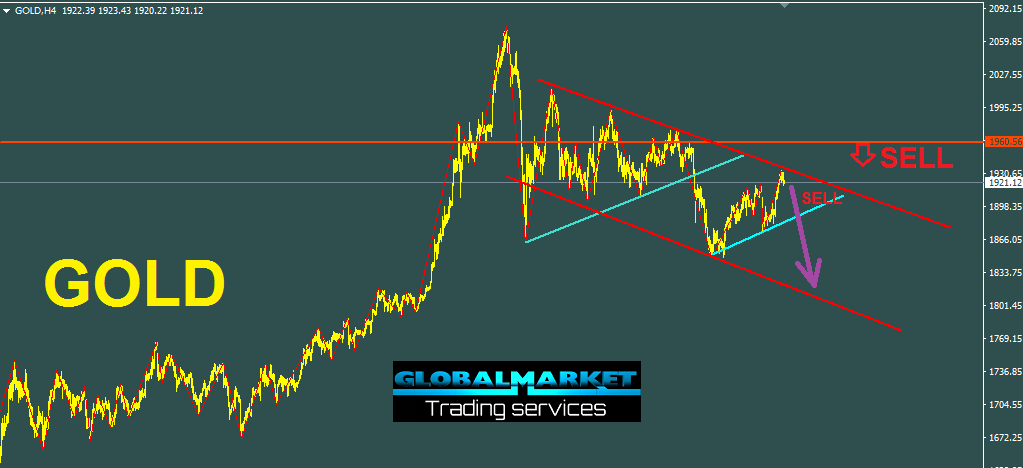 يتداول الذهب فى قناة هابطة على شارت H4 مكون قمم هابطة بشكل مثالى وكسر ترند صاعد فرعى داخل القناة ومن ثم يحاول الضغط السلبى مرة اخر لكسر الترند الفرعى الصاعد داخل القناة الهابطة والذى بكسرة سيهبط السعر بشدة . يمكن البيع مباشرة من السعر الحالى 1920 . والتعزيز بالبيع مرة اخرى بعد كسر الترند الفرعى وصولا لمستويات 1867 - 1860 .