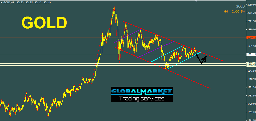 يتداول المعدن الأصفر داخل قناة هابطة على فريم H4 وبزخم هابط منتظم يتخللة بعض التصحيحات الصاعدة داخل الأطار الأساسى وهو القناة الهابطة . نتوقع كسر الذهب للترند الفرعى داخل القناة الهابطة مستهدفا منطقة 1865 - 1860 وهى منطقة الدعم التالى على الشارت . ننصح التجار بالحفاظ على وقف الخسارة المناسب