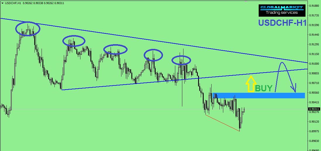 يتداول الدولار فرنك اسفل منطقة مقاومة على H1 المشار اليها بالمستطيل الأزرق . السعر الان يكون عزم شرائى قوى مدعوم من الدايفرجنس ننظر كسر المقاومة للأعلى والدخول شراء واستهداف مستويات المثلث للبيع منها مرة اخرى اسفل الترند الهابط ننصح بهدف الصفقة للتجار المحترفون فقط بالتداول .