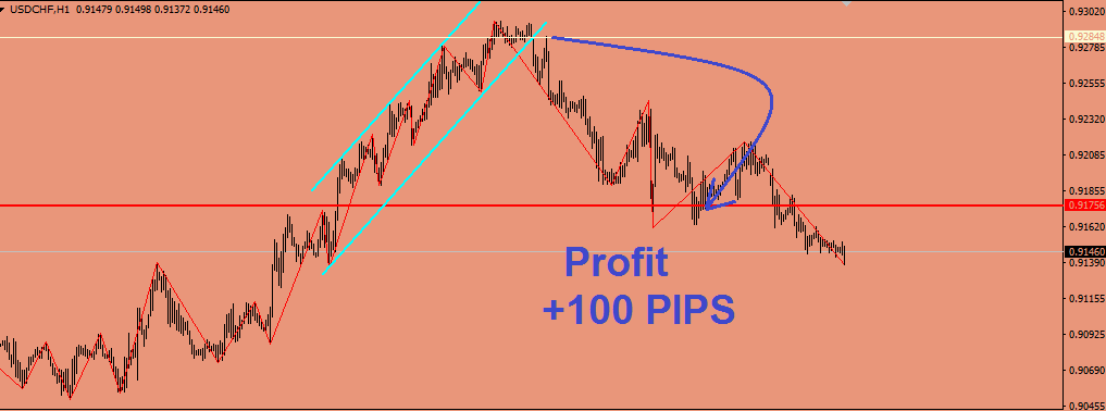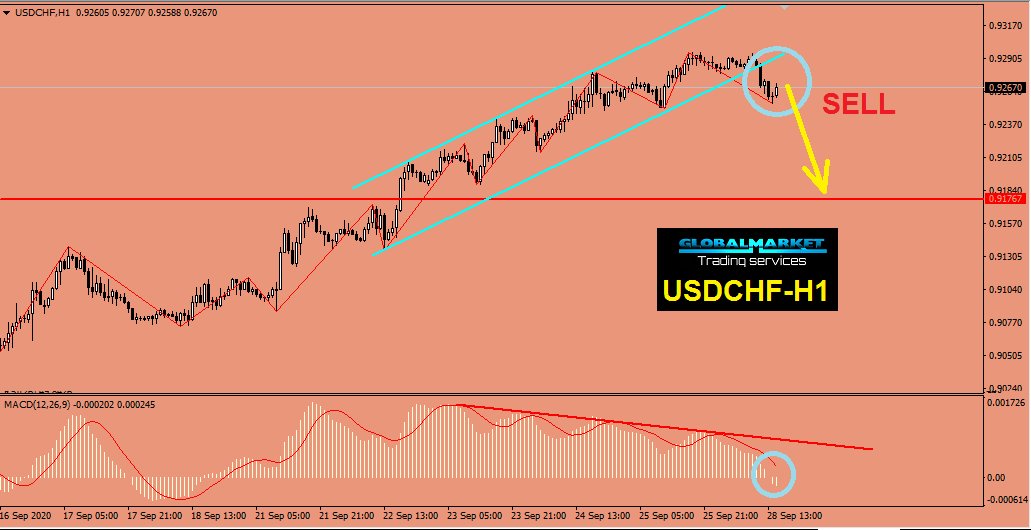 الدولار فرنك على شارت h1 - كسر القناة الصاعدة وتداول اسفل منها بقوة مما يدفع السعر للهجوم السلبى مباشرة حتى مستوى 0.9175 ويتضح لنا على موشر الماكد MACD ان الزخم السلبى قوى مع ظهور دايفرجنس وترشيح بيع على المؤشر . الدخول بصفقات بيعية فقط سيكون ممتاز وننصح التجار بالحفاظ على وقف الخسارة المناسب