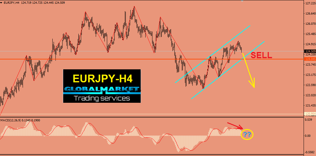 اليورو ين : يتداول فى قناة صاعدة على شارت H4 . الدخول بيع مباشرة بعد ظهور ترشيح البيع على مؤشر الماكد MACD حتى وان لم يكسر السعر القناة الصاعدة وذلك نظرا للزخم البيعى للزوج فى الوقت الحالى . بعد ظهور الأشارة البيعية اى انعكاس للسعر داخل القناة يمكن التعزيز بالبيع من اسعار افضل . ننصح التجار بالحفاظ على وقف خسارة مناسب