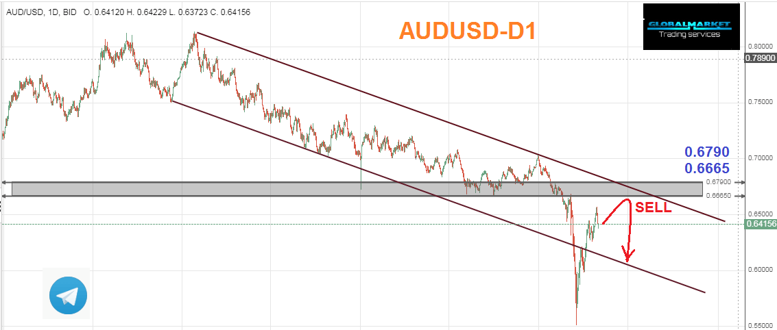 يتداول زوج الأسترالى دولار على شارت الديلى D1 داخل قناة هابطة رئيسية واسفل منطقة عرضية وهى 0.6665 - 0.6790 وتعتبر هذة المنطقة منطقة بيع قوية حيث كسرها السعر واعاد اختبارها فى 9-3-2020 وهبط منها السعر اكثر من 1000 نقطة .