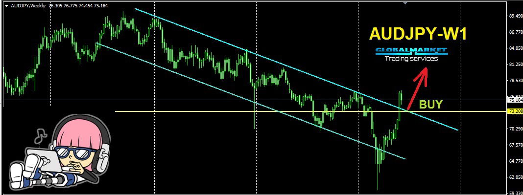 يتداول زوج الاسترالى يابانى على الشارت الاسبوعى W1 - اعلى قناة هابطة بعدما كسر الترند الهابط . نتوقع رجوع السعر لمستوى الترند الهابط للأختبار عند 73.20 ومن ثم الصعود . ننصح التجار بدخول صفقات شرائية فقط على الزوج