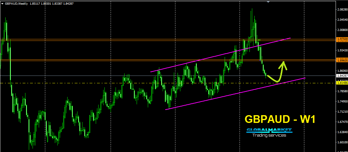 يتداول زوج الباوند استرالى على الفريم الاسبوعى W1 . اعلى ترند صاعد منذ العام الماضى والزوج لدية العزم السلبى للهبوط وصولا للضلع السفلى للقناة بالتزامن مع الألتقاء مع الدعم فى مستوى 1.8150 .
