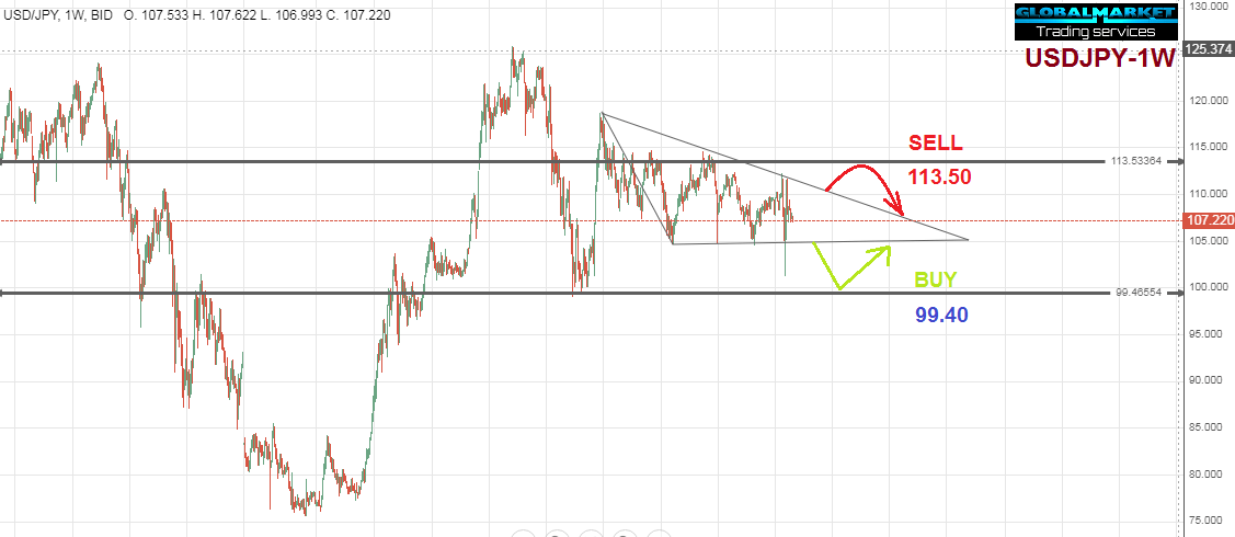 اما فى حالة ان كسر السعر قاعدة المثلث وبالتحديد مستوى 104.00 يمكن الدخول بيع حتى نقطة الشراء الرئيسية عند 99.40