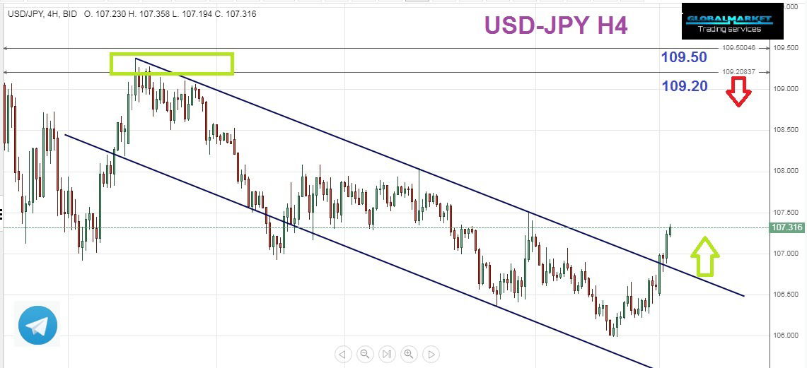 يتداول الزوج الان خارج القناة الهابطة على شارت الاربعة ساعات بعد ما نجح فى كسر القناة بعزم ايجابى قوى استطاع من خلالة الكسر والاغلاق اعلى القناة على H4 . بعد هذا الكسر النظرة ايجابية للزوج تماما وهو يستهدف مستويات عليا 109.20 - 109.50 كأهداف اخيرة علوية . نتوقع معاودة السعرة مرة اخرى لاختبار الترند الهابط المكسور وتجميع السعر لعزم ايجابى جديد ومن ثم الصعود الى اهدافة العليا خلال الاسبوع .