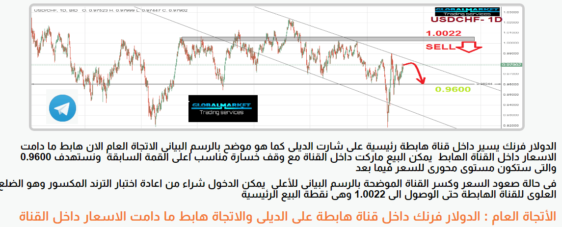 يلغى الشراء من 0.9600 والعمل مع الأتجاة هبوطا داخل القناة وكلما ارتفع السعر داخل القناة كانت فرصة جيدة للبيع من اسعار افضل مع الحفاظ على وقف خسارة مناسب.