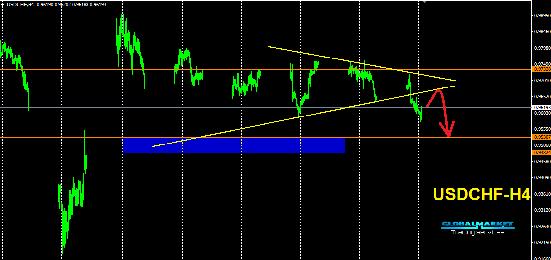 يتداول زوج الدولار فرنك على فريم H4 اسفل المثلث المكسور الذى انحصر بداخلة السعر لعدة اسابيع ماضية وهو الأن بصدد الاختبار ومن ثم استئناف البيع مرة اخرى. ننصح التجار بدخول صفقات البيع اسفل المثلث المتماثل مع الحفاظ على وقف خسارة مناسب اعلى القمم السابقة