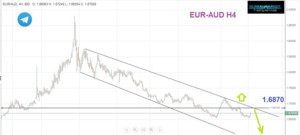 يتداول اليورو استرالى فى قناة هابطة على H4 . اتجاة الزوج هبوطى مادامت الاسعار داخل القناة الموضحة بالرسم البيانى اعلاة . مستوى 1.6870 هو مستوى محورى للزوج ويلتقى مع حافة الضلع العلوى الهابط للقناة مما يشكلان مقاومة قوية للسعر قد تدفعة لاستئناف الاتجاة الهابط مرة اخرى بعد الاختبار وغالبا سيكون اليوم او غدا على الأكثر .