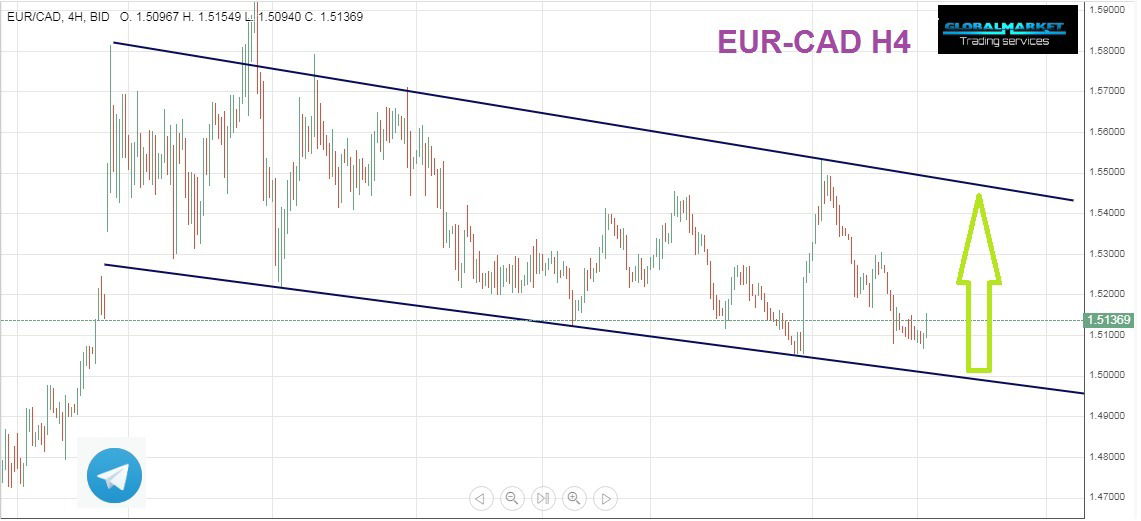 يتداول اليورو كندى داخل قناة تميل الى الهبوط قليلا بشكل اخر يعتبر السعر فى منطقة عرضية فى قناة عرضية تميل الى الهبوط . السعرالان يتداول عند مستوى دعم عند القاع الاخير بالالتقاء مع الحافة السفلية للترند القناة .