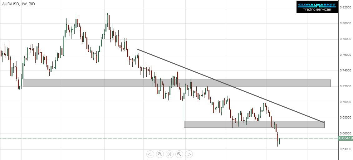 يتداول الاسترالى دولار على الشارت الاسبوعى اسفل الترند الهابط الموضح بالرسم اعلاة . اضافة الى ذلك كسر دعم اسفل الترند منذ اسبوعين ويتداول اسفل منة . ننتظر التصحيح الى الدعم المكسور المشار الية بالمستطيل العرضى عند 0.6660 ومن ثم الهبوط مرة اخرى