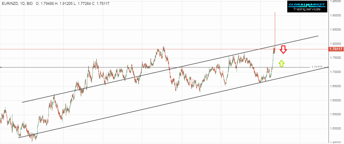 زوج اليورو نيوزلاندى على شارت الديلى كما موضح بالرسم البيانى اعلاة صعد بقوة واصطدم بالضلع العلوى للقناة الصاعدة ولكنة لم يستطيع الاغلاق اعلى منة باى شارت من الشارتات .