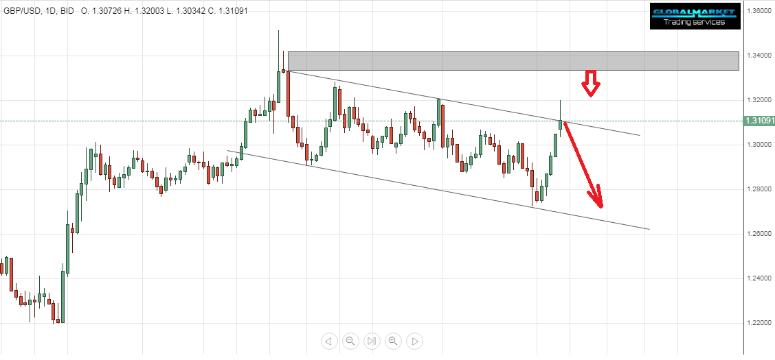 It is also possible to sell from the resistance area 1.3340 - 1.3420 and the final goal is the upper channel rib which will be broken at the time while maintaining the stop 1.3525