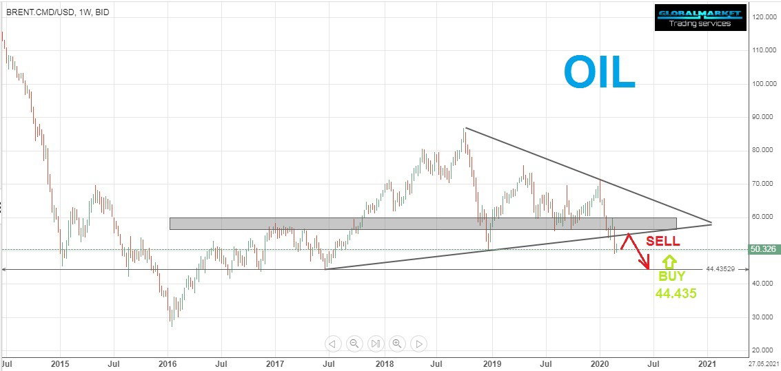 Oil is trading below the broken uptrend last week, we expect a further drop in oil to continue to the level of 44.43 and it is likely that the broken trend will be tested first, even if that happens, we can enter selling from the test until the point of purchase 44.43